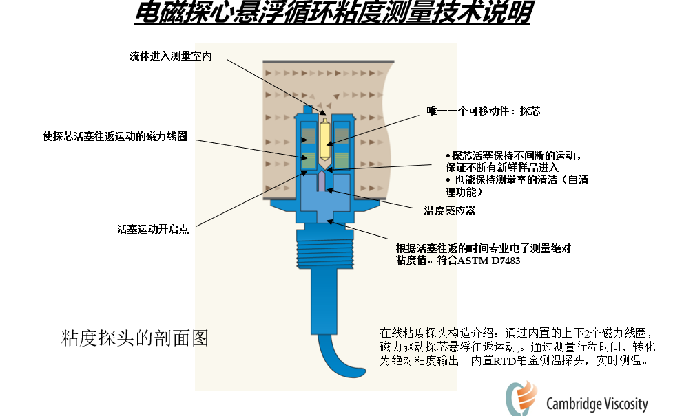 美國PAC公司電磁粘度計采用的磁懸浮探心循環(huán)檢測技術(shù),技術(shù)眼原理如下: VISCOpro2000/2100電磁粘度計傳感器內(nèi)置上下2個線圈,控制器通電后,線圈通電并產(chǎn)生電磁力,磁力推動探芯在流道內(nèi)上下往返運動,通過測探芯在流道內(nèi)的運動時間,轉(zhuǎn)換為絕對粘度(動力粘度),顯示并輸出。傳感器流道底位置,內(nèi)置一個RTD傳感器,實時測量并顯示流體溫度。