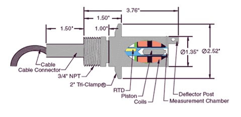 位于活塞上方的導流裝置,將液體導入測量室,活塞持續(xù)運動以不斷更新樣品,同時機械摩擦不斷擦洗測量室。 一個內(nèi)置的RTD溫度測量探頭,實時測量測量室的溫度。
